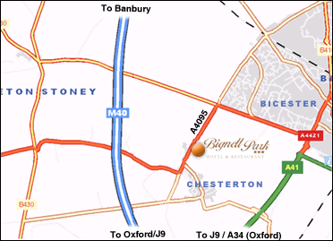 From the M40 Junction 9, take the A41 towards Bicester, after a mile you will see a sign for Chesterton / Wendelbury. Take this turning. The hotel is signposted from this exit.